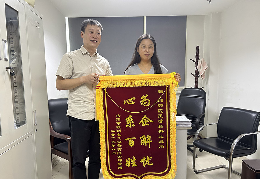 9月2日上午,銳創(chuàng)電氣負(fù)責(zé)人陳總前去瀛洲街道辦事處和澗西區(qū)民營經(jīng)濟(jì)發(fā)展局送去錦旗和一批愛心水果,感謝政府主動作為、高效協(xié)調(diào),幫助企業(yè)解決外地職工子女入學(xué)難題。